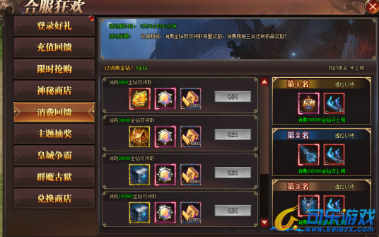 活动内容:活动期间,玩家消费金钻即可领取海量豪礼,消费前三的玩家还会获得额外极品奖励。