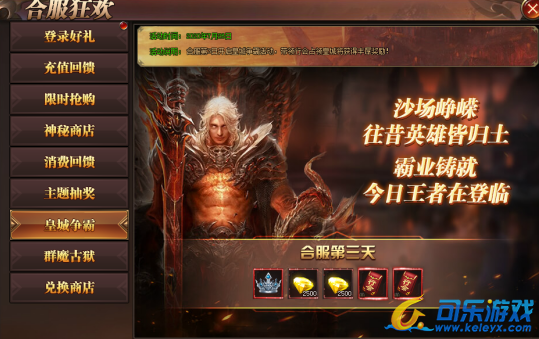 活动内容:合服第三天系统自动开启皇城争霸,活动期间占领皇城将会获得“雷霆皇冠”和大量金钻奖励。