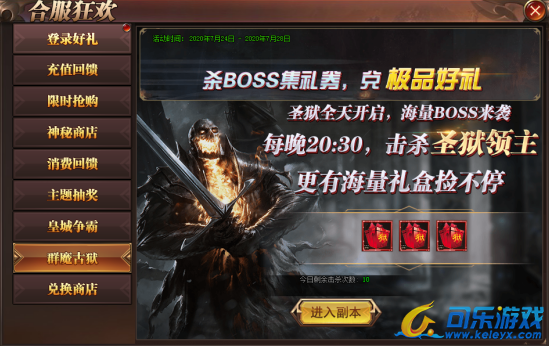 活动内容:活动期间内,消耗圣狱礼券可兑换各种稀有道具,参加“群魔古狱“等合服活动可获得大量圣狱礼券奖励。