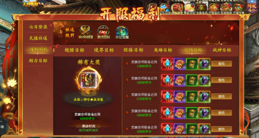 1、开服目标拓展,英雄、宗师、战神,三段目标带来更多奖励。