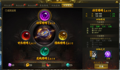 系统开放:开服14天250级,即可开启四相精炼系统 四相精炼系统会增加四相装备的攻击和防御,四件装备同时达到10级阶段还可以提升精炼套装属性。